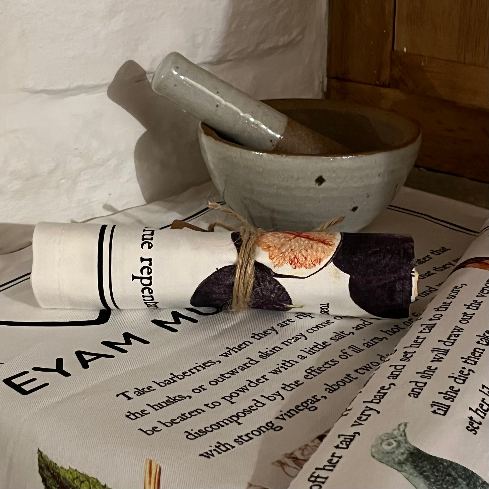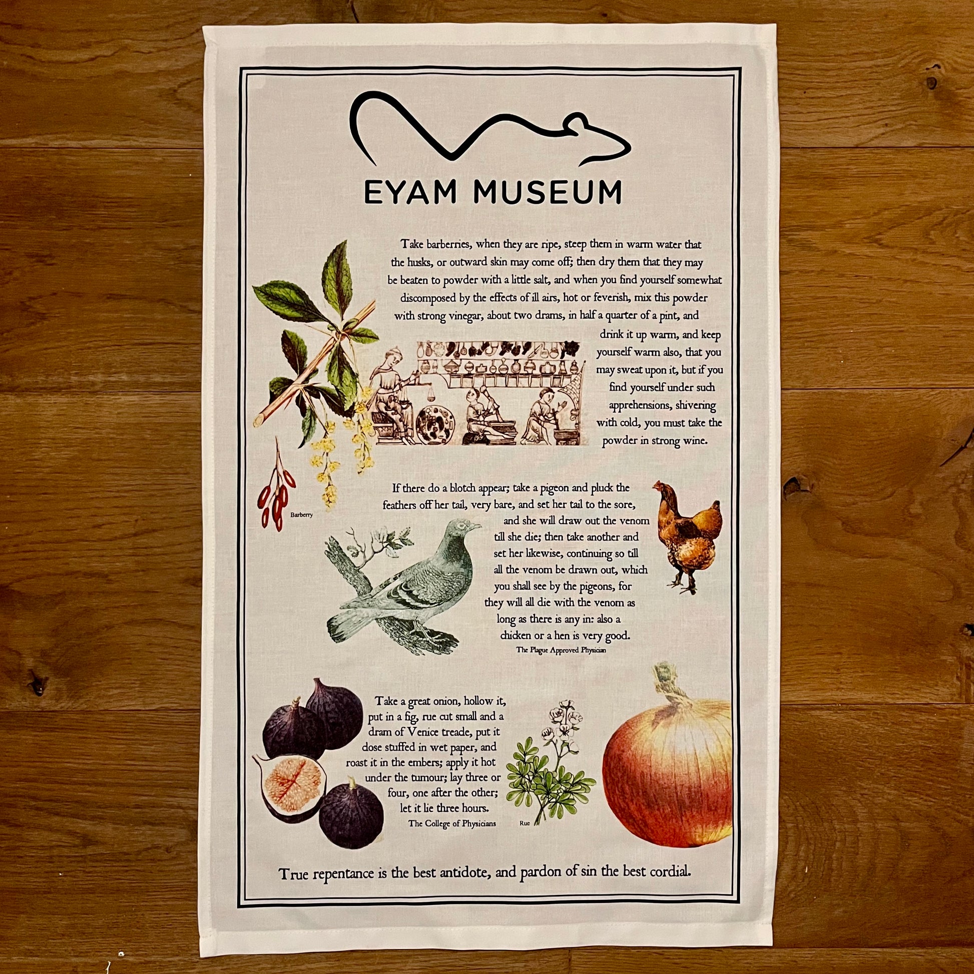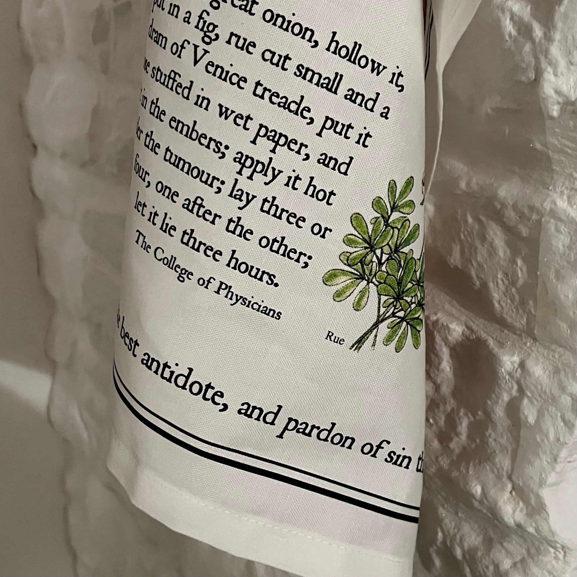 A 100% premium cotton tea towel featuring three 17th century plague remedies. It's a welcome distraction from drying the dishes!